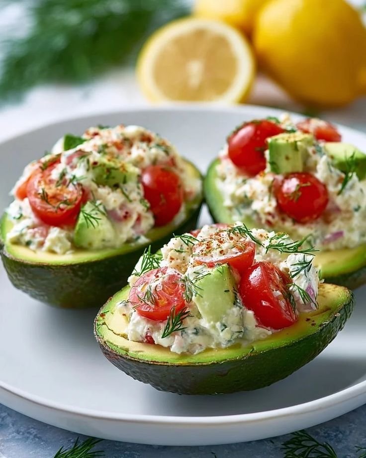 This dish pairs creamy avocado halves with a light, zesty tuna salad.