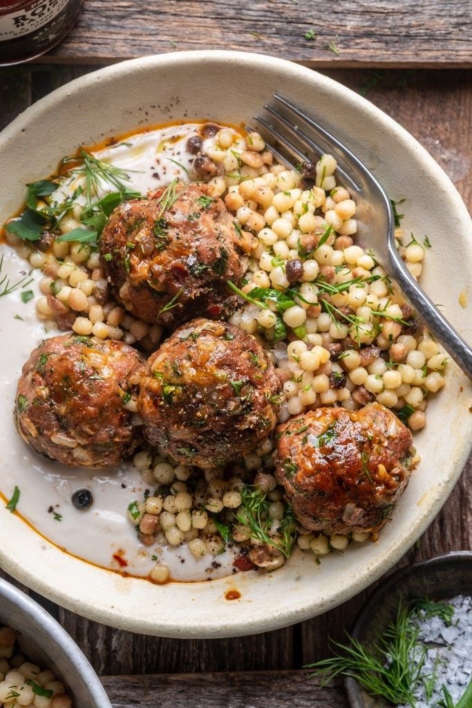 Spicy yet aromatic harissa meatballs served on a bed of nutty fregola (Sardinian toasted pasta pearls) and drizzled with a bright, creamy lemon yogurt sauce. This Mediterranean dish is rich in flavor, visually stunning, and perfectly balanced — spicy, tangy, and hearty.