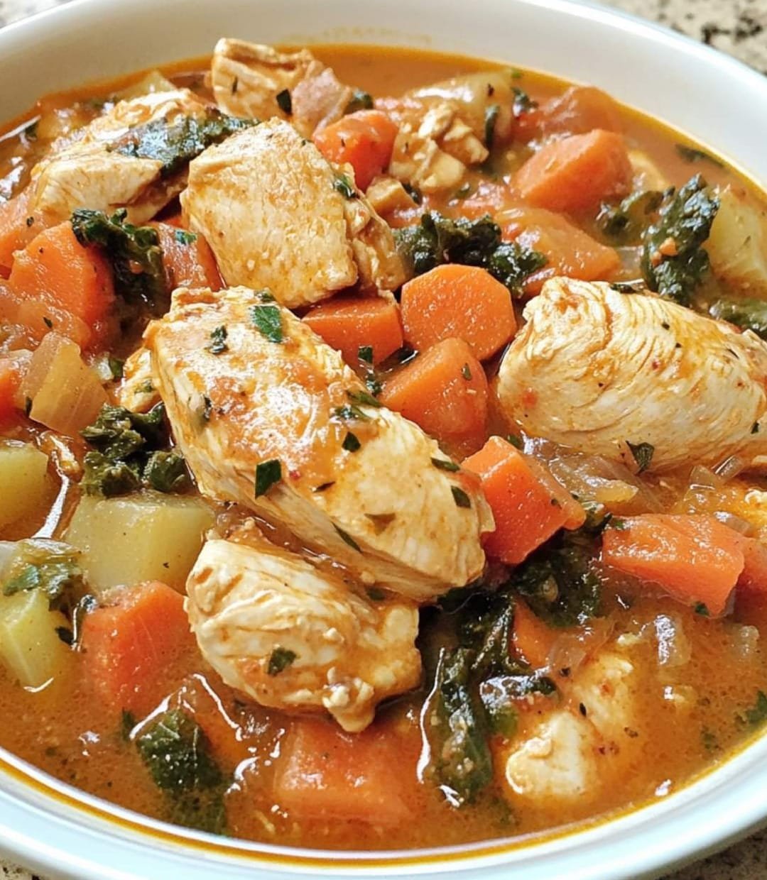 Tuscan Chicken Stew is a hearty and flavorful dish that captures the essence of Italian cuisine. This comforting stew features tender pieces of chicken simmered with vibrant vegetables, such as tomatoes, bell peppers, and spinach, all infused with aromatic herbs like rosemary, thyme, and basil. The addition of cannellini beans adds creaminess and protein, making it a well-rounded meal. With its rich flavors and rustic charm, this stew is perfect for a cozy family dinner or entertaining guests.