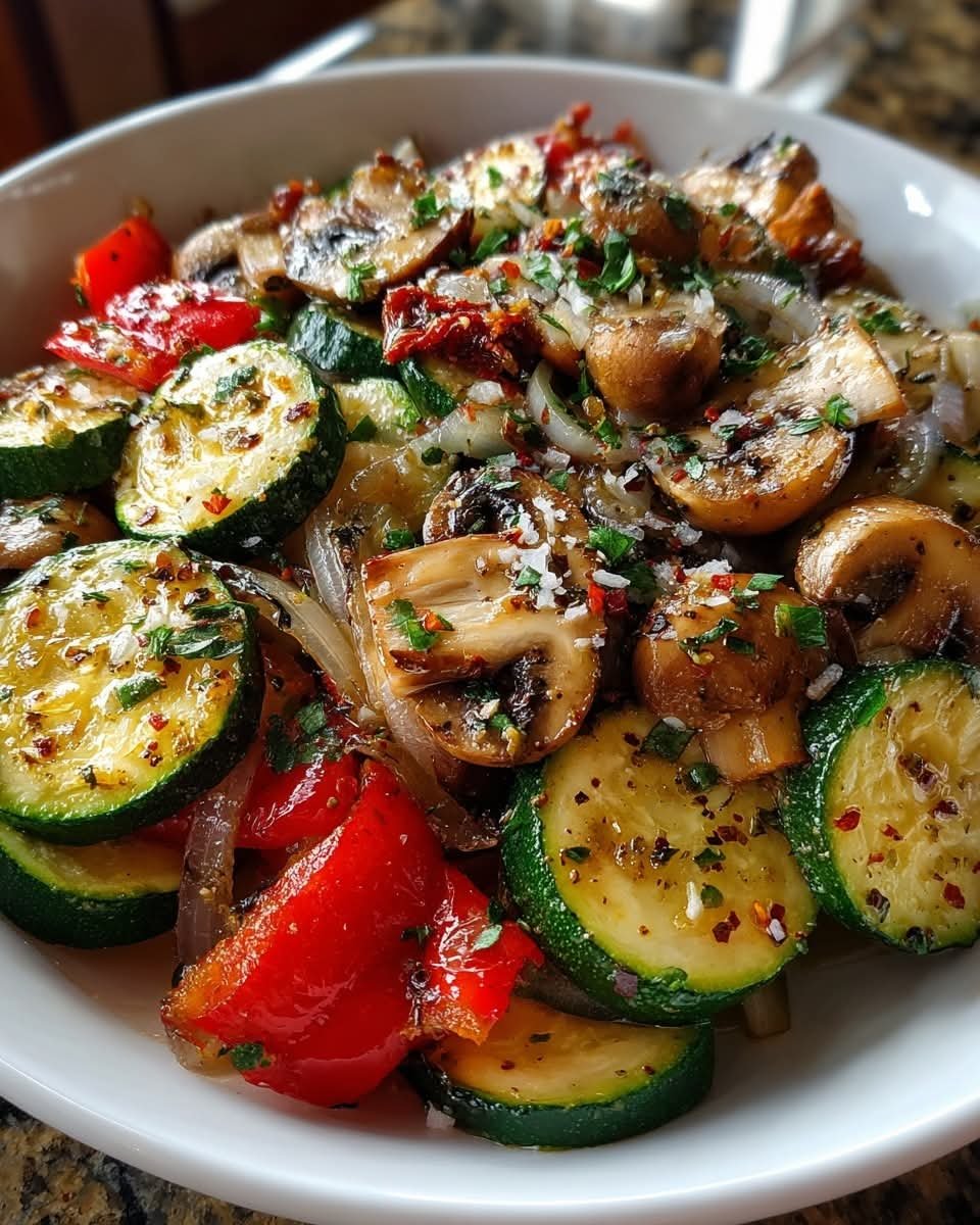 This Tuscan Zucchini & Mushroom Medley is a rustic, vibrant sauté featuring tender zucchini, earthy mushrooms, sun-dried tomatoes, fragrant garlic, and Tuscan herbs. It cooks quickly, uses simple wholesome ingredients, and pairs beautifully with chicken, pasta, polenta, risotto, or crusty bread. It can be served as a side dish or upgraded to a main with added protein.