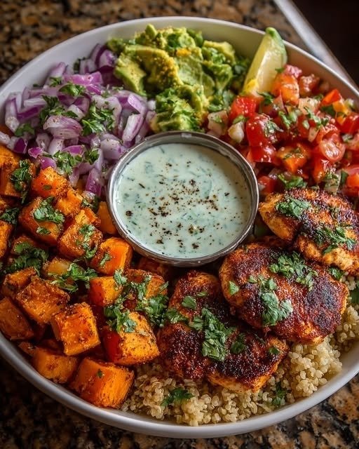 This Ultimate Grilled Chicken & Sweet Potato Bowl with Avocado Salsa and Spicy Yogurt Dip is the kind of meal that checks every box. It’s hearty but fresh, comforting yet bright, and packed with bold flavors and textures. Smoky grilled chicken pairs perfectly with caramelized roasted sweet potatoes, while a vibrant avocado salsa adds freshness and balance. The cool, tangy yogurt dip with a gentle kick brings everything together. Whether you’re meal prepping for the week, cooking a wholesome family dinner, or building a nourishing bowl after a long day, this recipe delivers flavor without feeling heavy or complicated. It’s flexible, colorful, and endlessly satisfying.