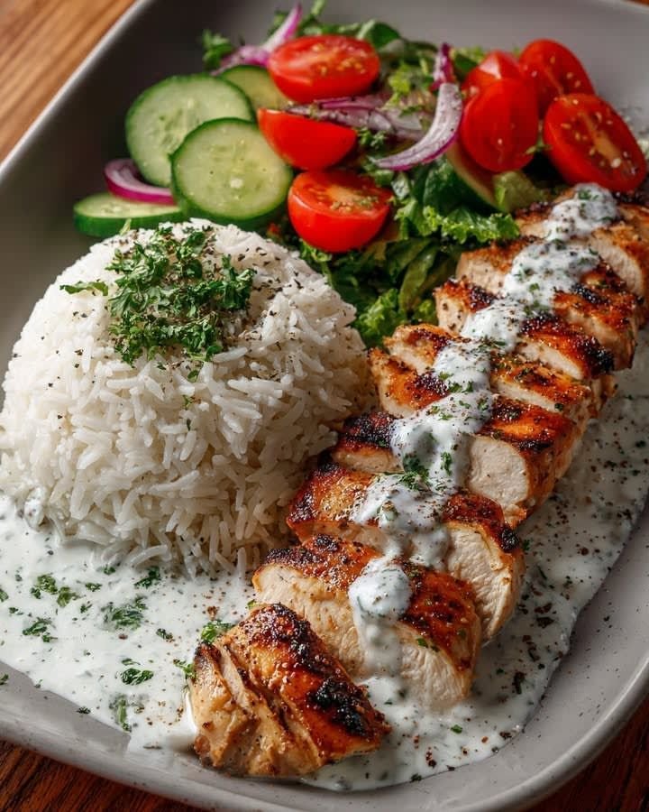 This dish combines juicy, perfectly grilled chicken with a silky creamy herb sauce, fluffy lemon-garlic rice, and a refreshing Mediterranean salad. It’s a complete, wholesome plate — rich in protein, flavor, and texture — perfect for a cozy dinner or impressive meal prep.