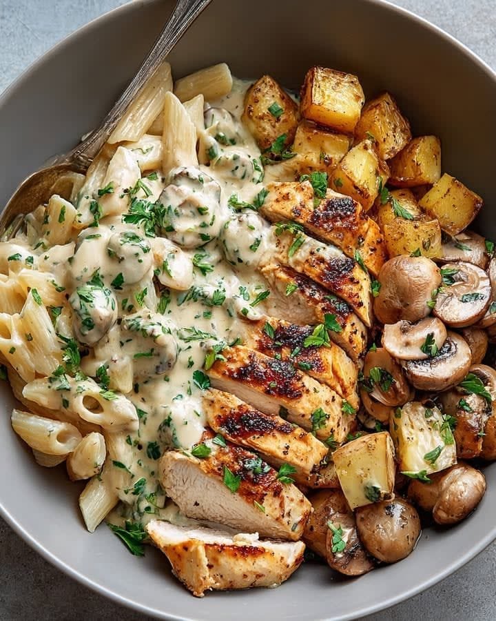 Juicy, herb-marinated grilled chicken served alongside creamy garlic mushroom pasta and golden roasted potatoes. This dish blends rustic comfort with elegance — perfect for a special dinner or weekend meal.