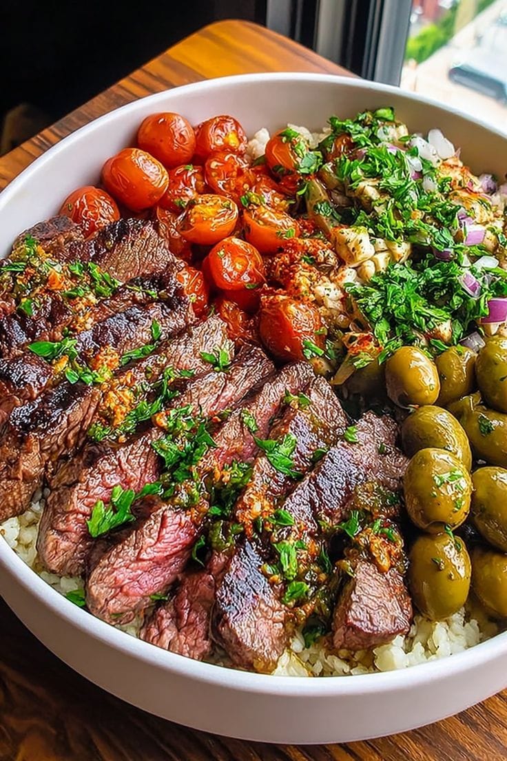 This hearty bowl pairs perfectly seared steak with fluffy grains, roasted vegetables, fresh Mediterranean salad elements, and a drizzle of creamy tzatziki or tahini sauce. Packed with protein, healthy fats, and colorful veggies, it’s both nourishing and indulgent.
