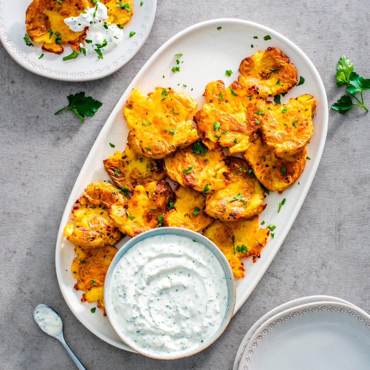 1. Arrange the crispy smashed potatoes on a serving platter.
