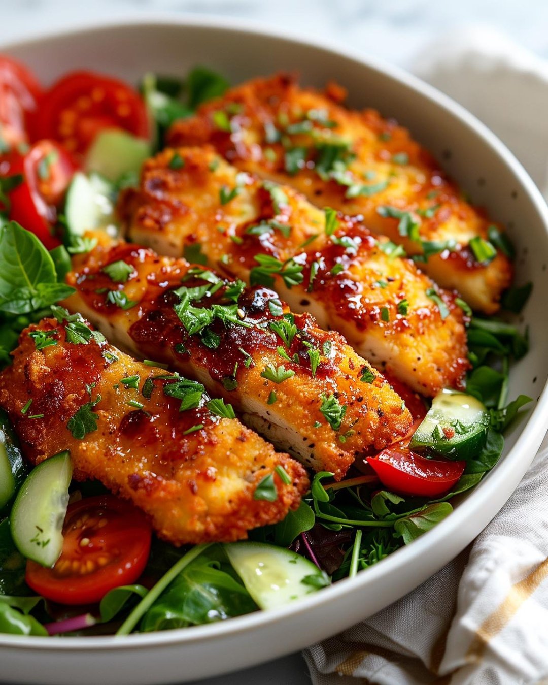 Golden crispy tofu strips that taste like fried chicken, served over fresh greens with crunchy veggies and a creamy dairy-free dressing. Perfect as a full meal salad.
