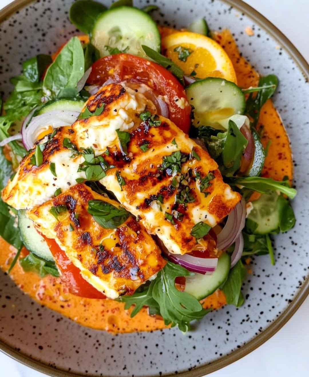 Pan-grilled vegan halloumi-style slices (made from firm tofu) served warm over crisp greens, tomatoes, cucumber, and olives. Fresh, satisfying, and restaurant-style.