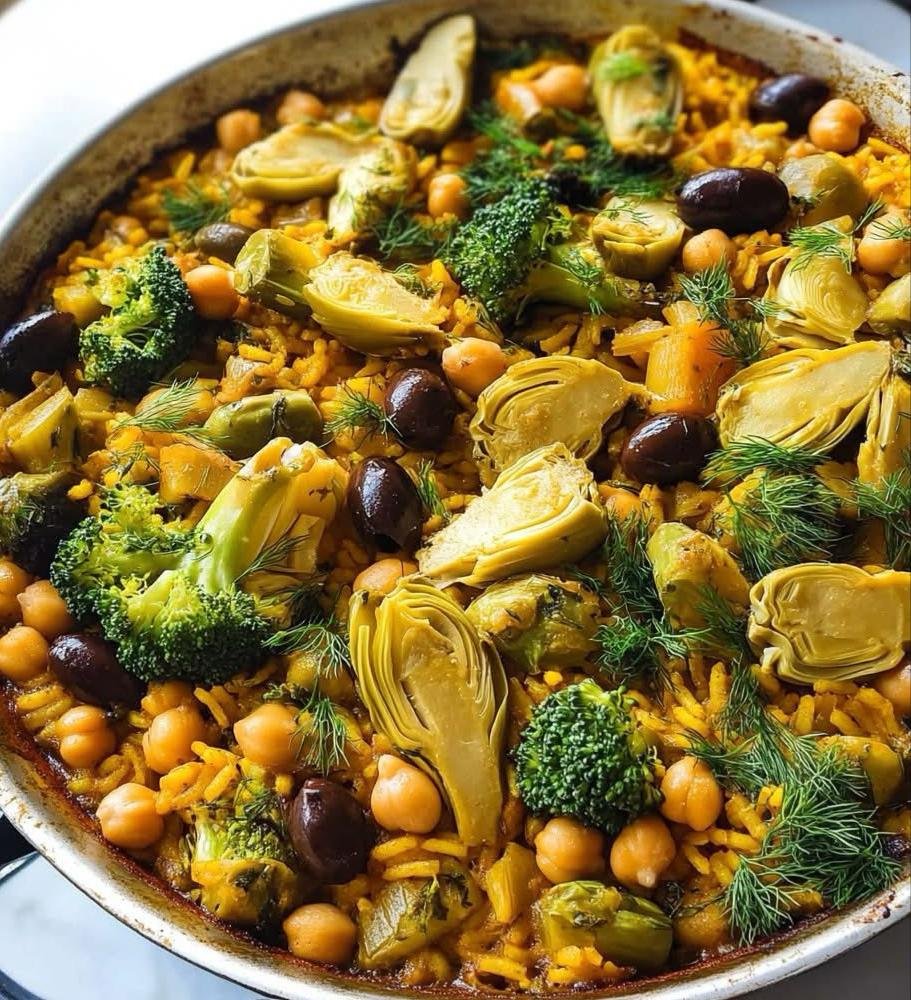 This vibrant vegan paella is a delicious and hearty dish packed with Mediterranean flavors. It features saffron-infused rice cooked with chickpeas artichokes olives and fresh herbs creating a colorful and satisfying meal. Perfect for a family dinner or special occasion this one-pan dish is both easy to make and full of nutrients.