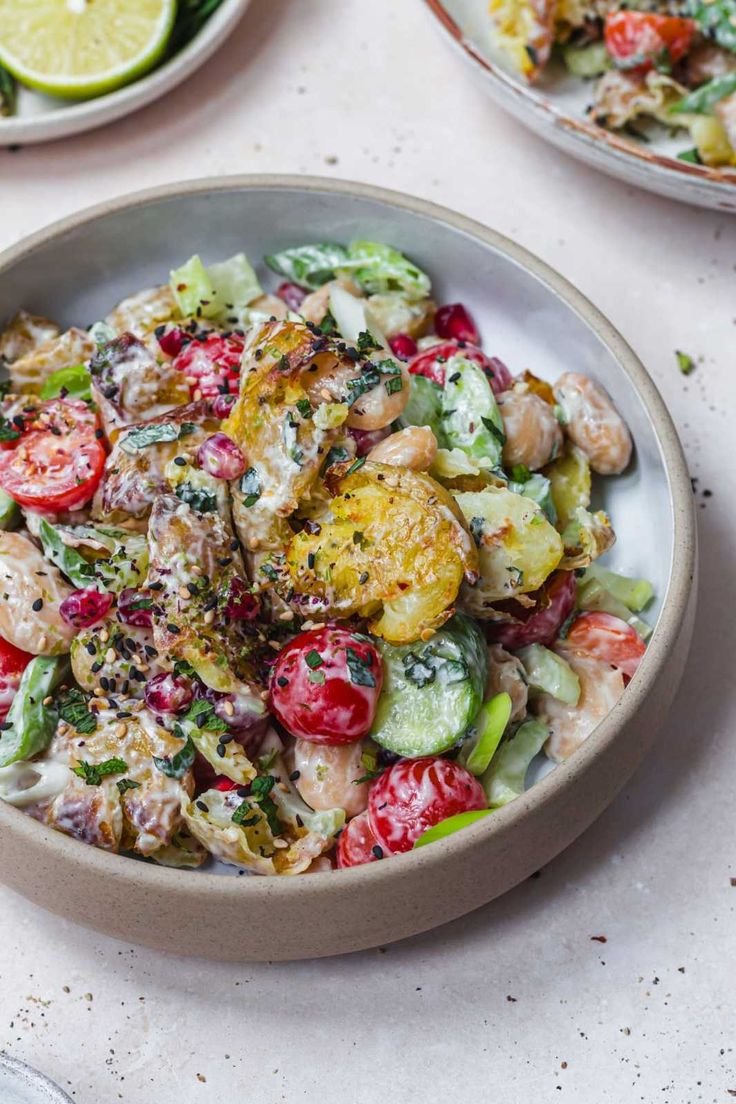 This Vegan Smashed Potato Bean Salad with Tahini Yogurt is a hearty, nourishing, and flavor-packed dish. Crispy roasted smashed potatoes are combined with protein-rich beans, crunchy fresh vegetables, and fragrant herbs, then coated in a creamy tahini–vegan yogurt dressing.