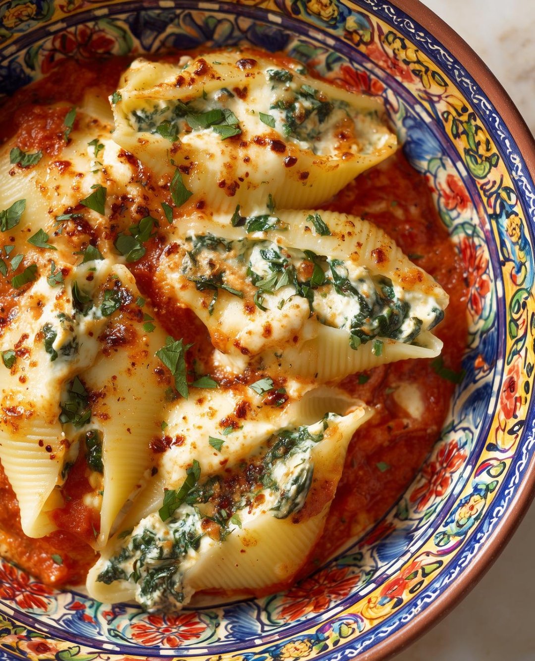 Large pasta shells filled with a creamy spinach-herb ricotta-style filling, baked in a light tomato sauce and finished with olive oil and herbs. Cozy, elegant, and perfect for dinner or meal prep.