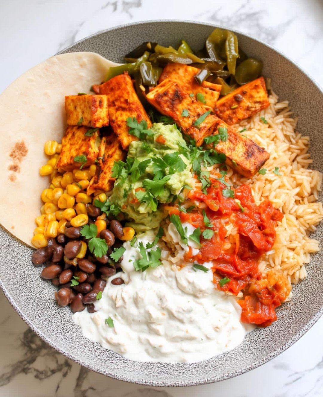 Fluffy rice topped with smoky beans, sautéed peppers, sweet corn, fresh salsa, and creamy avocado. A balanced, protein-rich vegan bowl with bold Tex-Mex flavors.