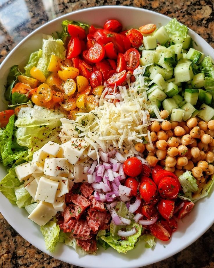 This Italian Chopped Salad is a vibrant mix of crisp romaine, juicy tomatoes, chickpeas, crunchy vegetables, and cubes of cheese — all tossed in a zesty Italian herb vinaigrette. It’s satisfying enough for a main dish, high in protein and fiber, and perfect for lunches, picnics, or light dinners.