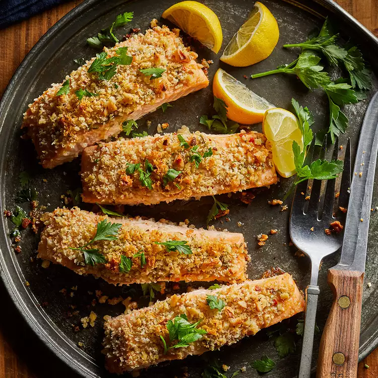 Salmon and walnuts are both great sources of omega-3 fatty acids. Pair this easy walnut-crusted salmon recipe with a simple salad and a side of roasted potatoes for dinner.