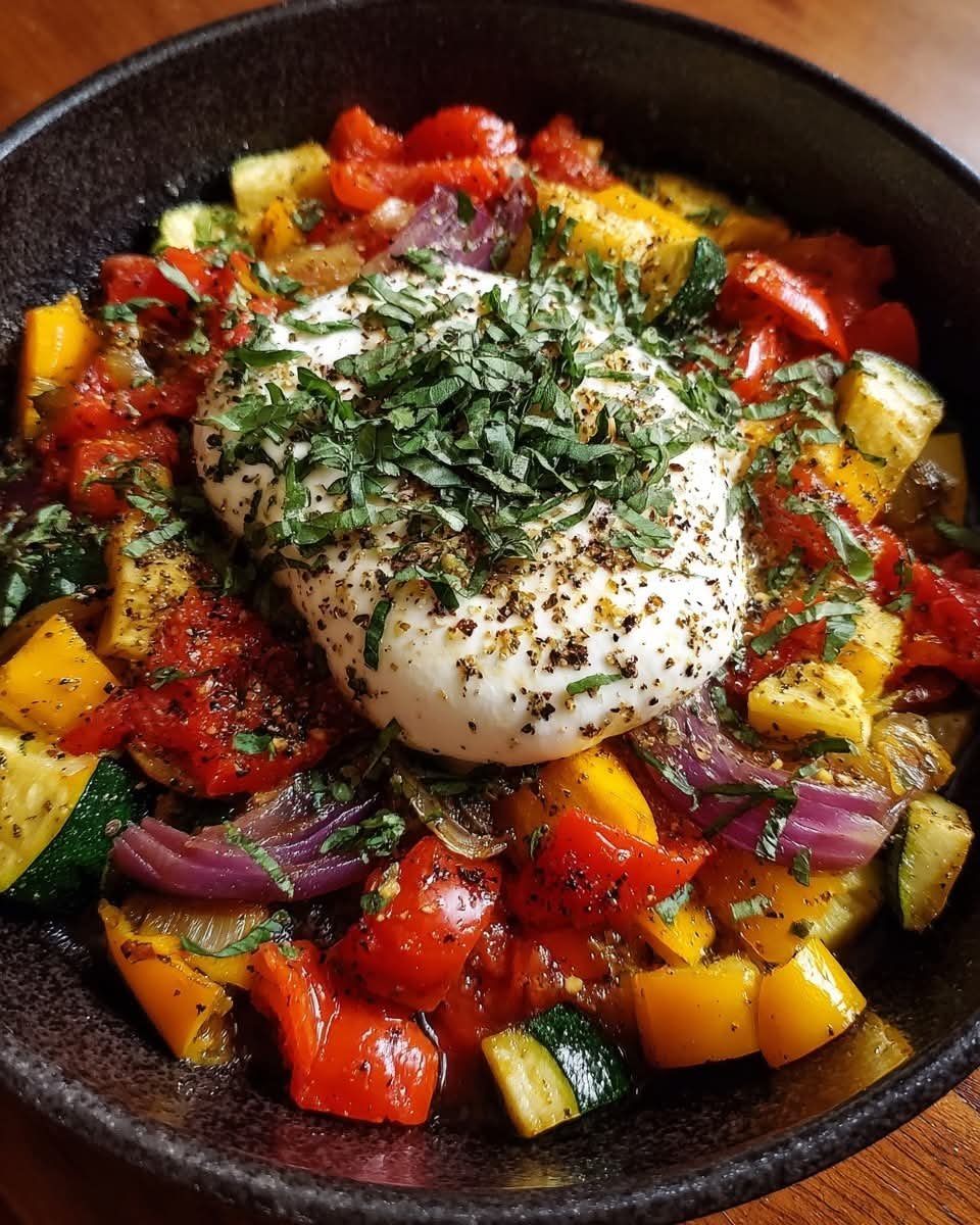 A rustic, colorful skillet filled with caramelized garlic-roasted vegetables, finished with silky smooth warm burrata that melts into the veggies like a creamy sauce. The dish feels both indulgent and bright—perfect as a light dinner, brunch side, or appetizer with crusty bread.