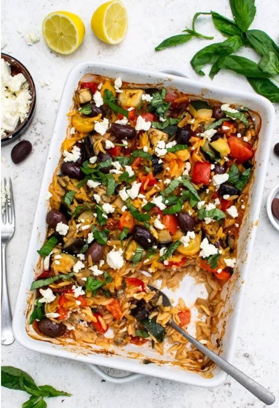 Warm Mediterranean Orzo Bowl with Roasted Garlic Eggplant & Whipped Feta