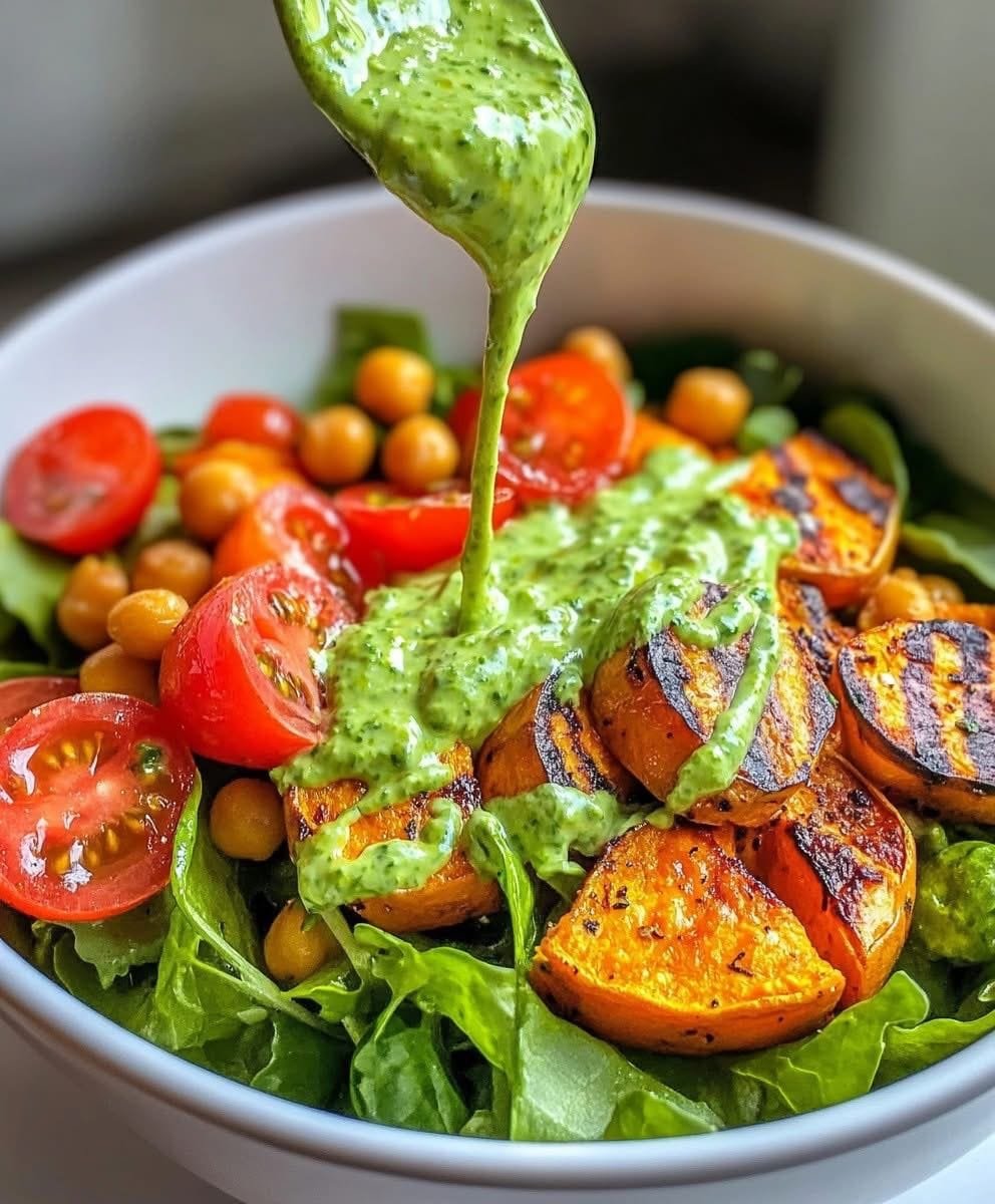 This Sweet Potato Chickpea Salad Bowl is a colorful and wholesome meal that brings together roasted sweet potatoes, protein-rich chickpeas, juicy cherry tomatoes, and crisp greens, all drizzled with a creamy, herb-packed Green Goddess Dressing. It’s the perfect balance of comfort and nutrition — hearty enough for lunch or dinner, and fresh enough to keep things light. Whether you’re plant-based or just love veggie-forward meals, this bowl delivers big flavor and feel-good fuel in every bite.