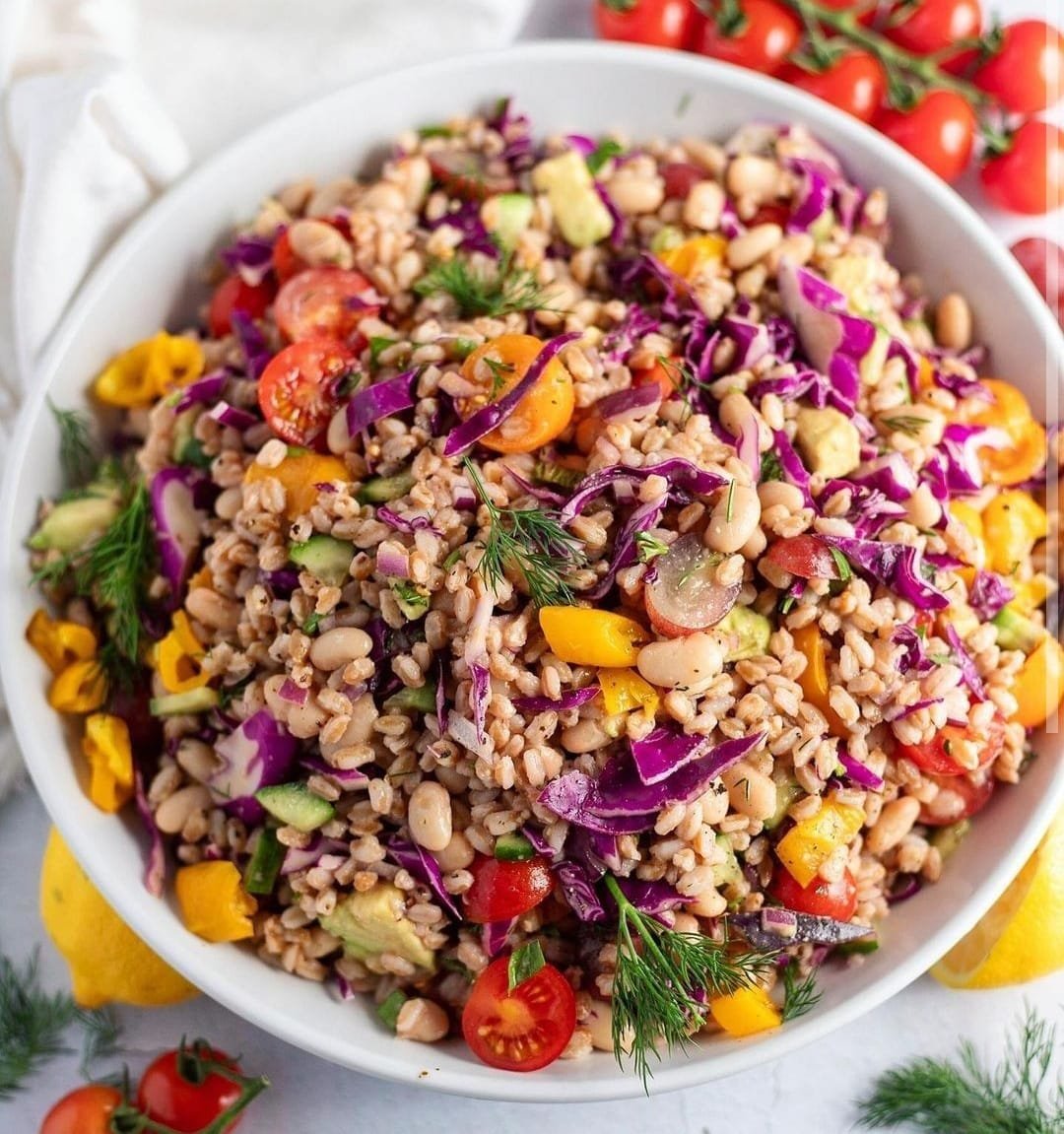 - To roast peppers, place them whole on a sheet pan and bake for five minutes at 400 degrees. Put away to cool. Remove the seeds and cut into little pieces.* To make the dressing, thoroughly combine the yoghurt, lemon, date syrup, and a little amount of salt and pepper.* Combine the cabbage, tomatoes, grapes, onion, cucumbers, beans, farro, avocado, and dill in a large mixing dish.