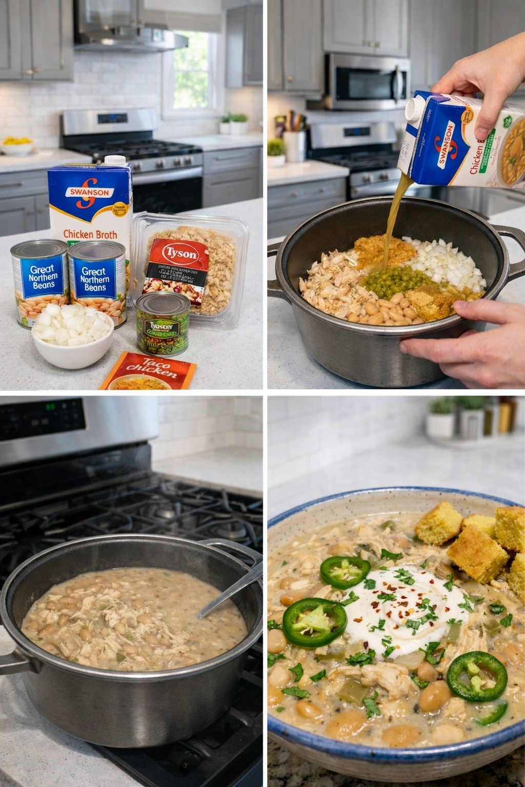 Add chicken, beans, green chilies, spices, and chicken broth. - Simmer