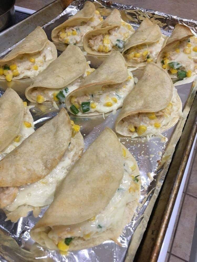 - Scoop about 2 Tbsp of chicken mixture into your tortilla, top with 1 Tbsp shredded cheese, and fold over, repeat with all 14 tortillas. I lightly sprayed all of the tortillas just before going into the oven to “crisp” them up a bit.