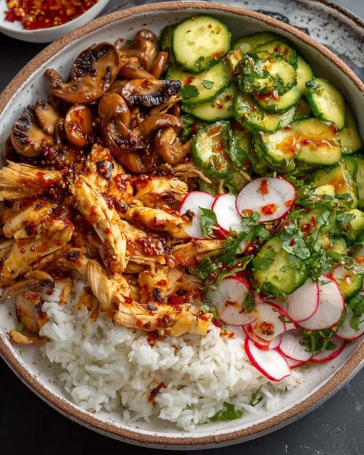 Tender sweet chilli–glazed chicken, sautéed with savory mushrooms, served over a light grain base and topped with a cool, crunchy cucumber salad. This bowl is sweet, umami-rich, refreshing, and ideal for a healthy, satisfying meal.