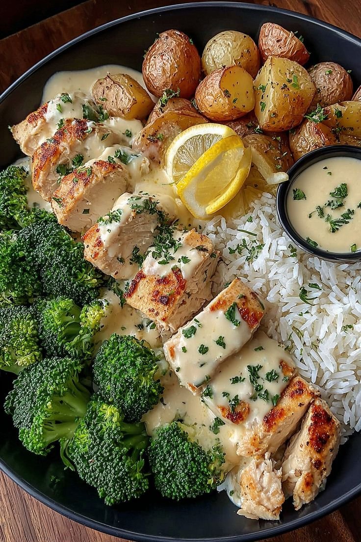 Zesty Creamy Lemon Chicken Bowl with Rice, Potatoes & Veggies